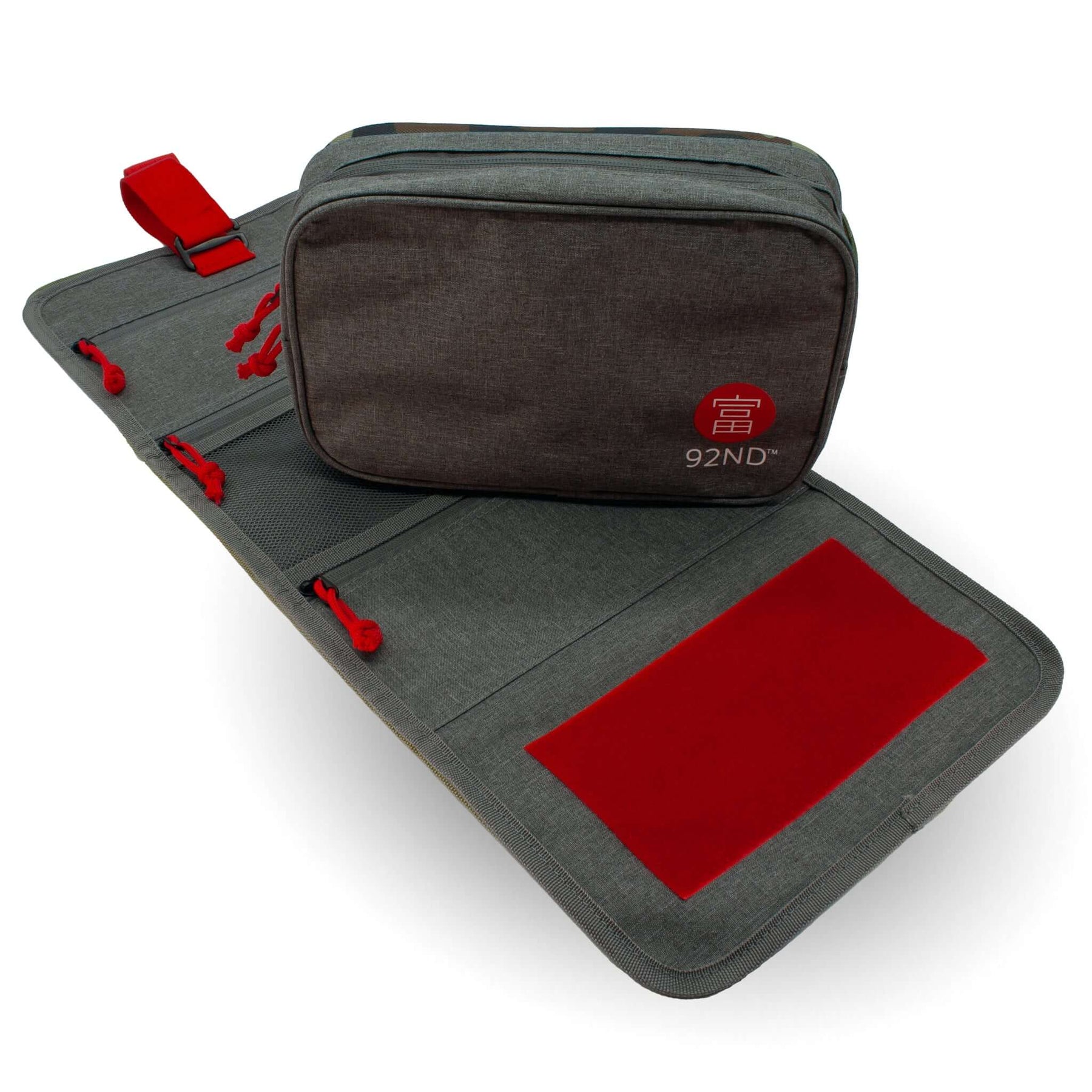 Hanging toiletry bag Washroll grey with red logo, foldable and ideal for hanging for overview and order.