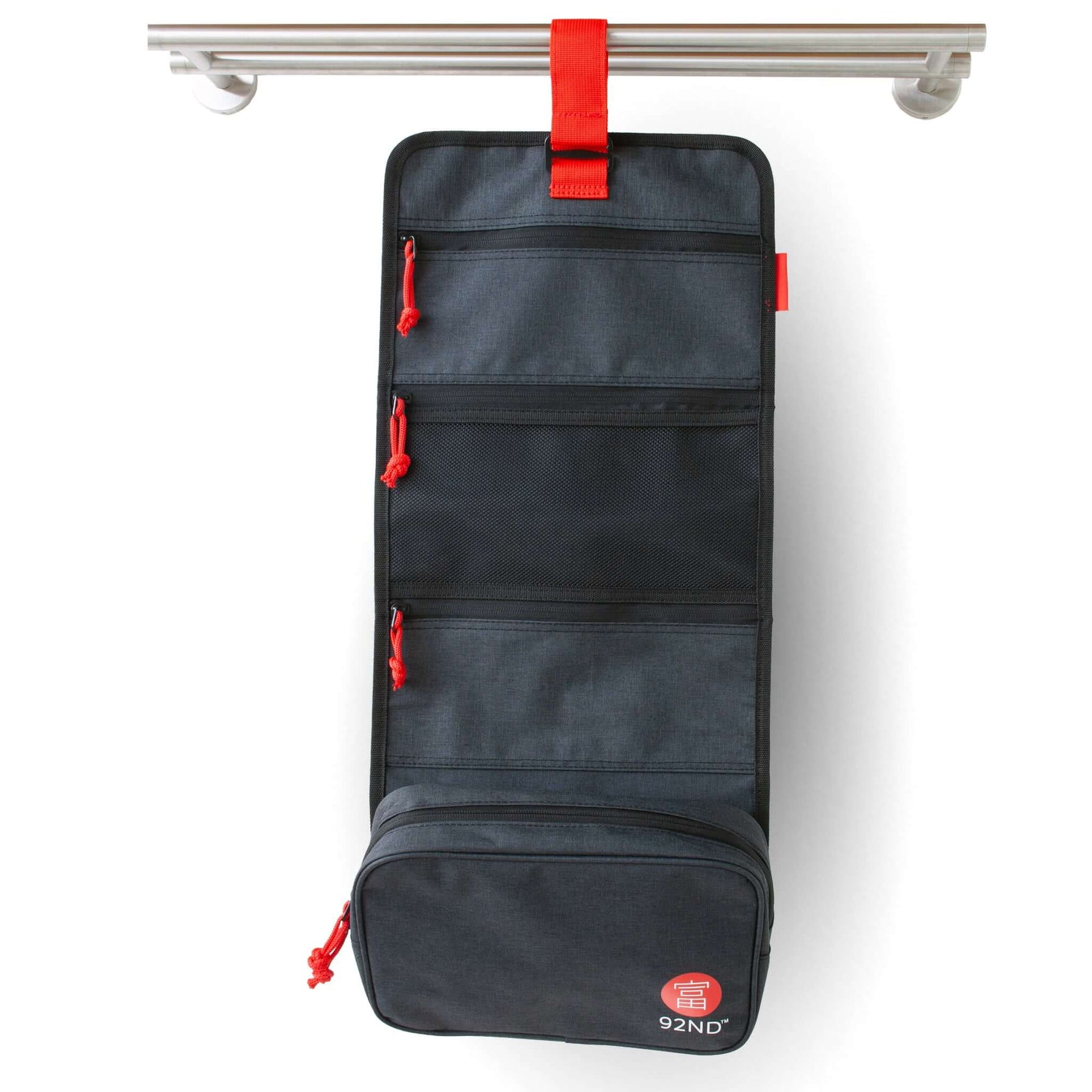 Hanging toiletry bag Washroll black – hanging organiser with multiple compartments and red accents.