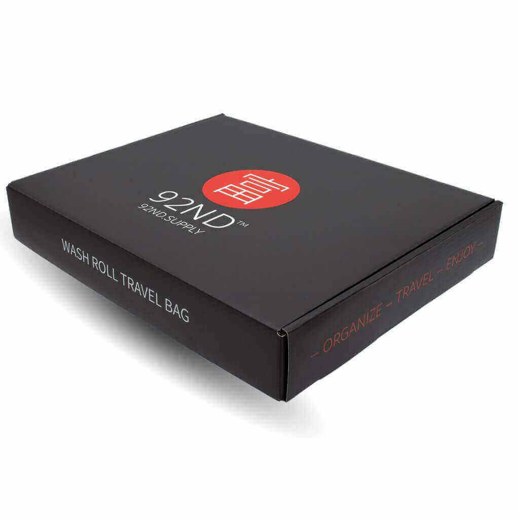 Hanging toiletry bag Washroll gray, packaging with logo and description on white background.